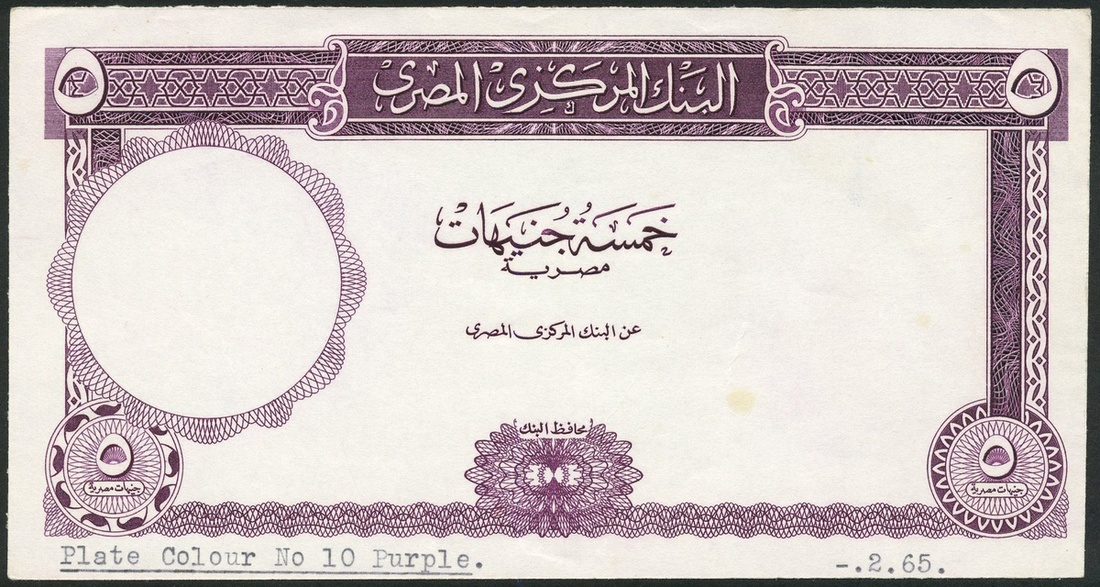 Central Bank of Egypt, obverse partial die proof £5, 1965, purple, ornate borders, value at each corner