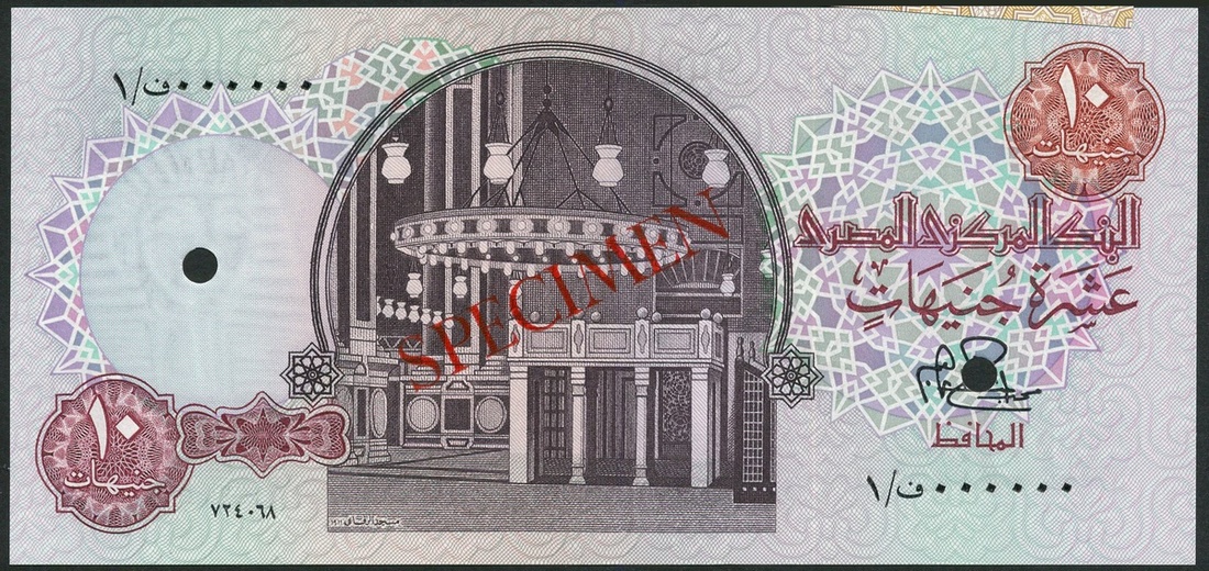 (†) Central Bank of Egypt, specimen 1 pound, 1978, brown, the Mosque of Sultan Qait Bey at centre, Ibrahim signature, also specimen 10 pounds, 1978, pale blue and lilac, Al-Rifai Mosque