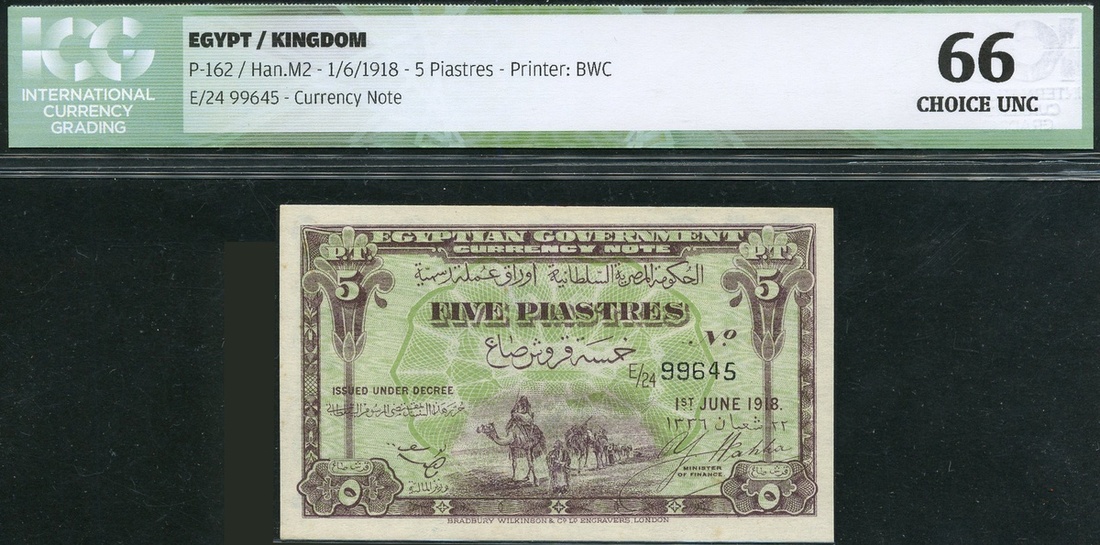 Egyptian Government Currency Note, 5 piastres, 1 June 1918, serial number E/24 99645, dark lilac on light green underprint, bank title top centre, camel train low centre, Wahba signature reverse, blue panel