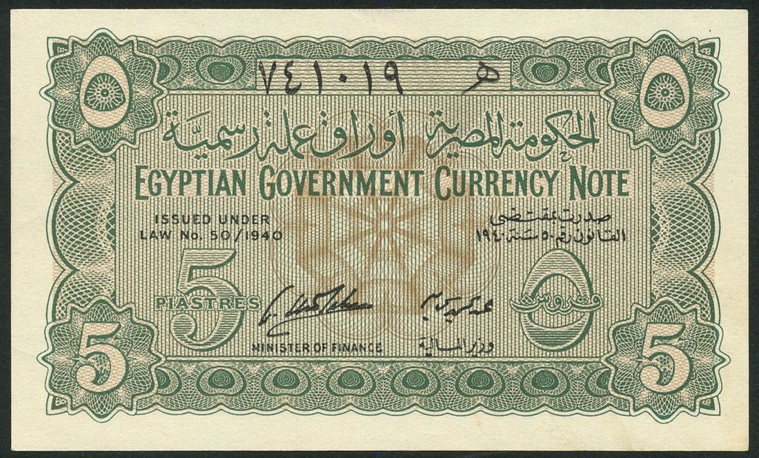 (x) Egyptian Government Currency Note, 5 piastres, law of 1940, serial number 641019, green and brown, reverse purple, the Aswam dam at centre