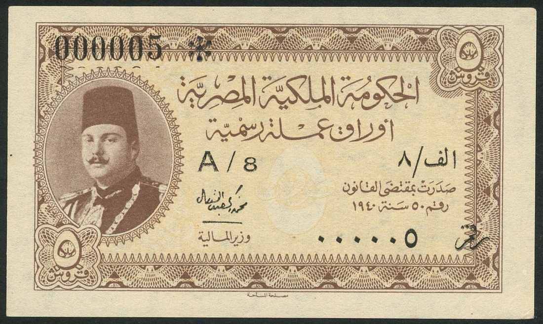 (x) Egyptian Government Currency Note, 5 piastres, ND (1940), serial numbers A/8 000005, brown on yellow underprint, King Farouk at left, Zaky signature, reverse black on blue underprint