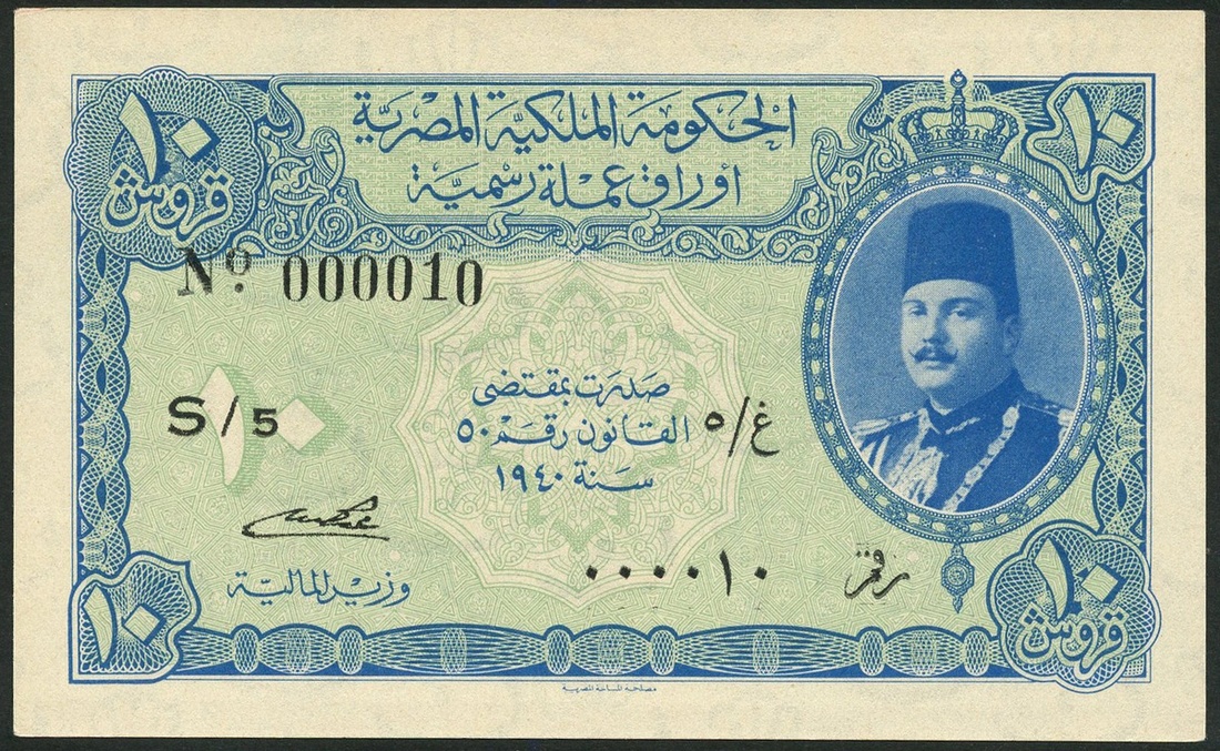 Egyptian Government Currency Note, 10 piastres, ND (L.1940), serial number S/5 000010, blue on light green underprint, portrait King Farouk in ornate circular frame at right, value in each corner and at centre left, Ebeid signature, reverse, green on pink underprint
