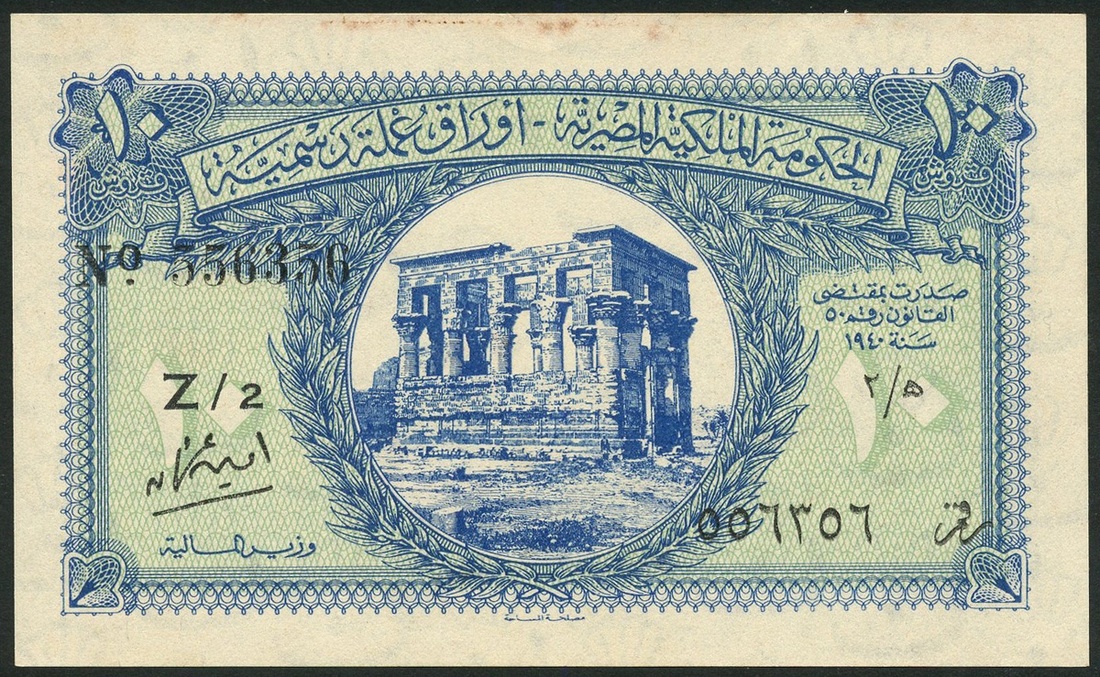 (x) Egyptian Government Currency Note, 10 piastres, L.1940, serial number Z/2 556356, blue on green underprint, temple of Philae at centre, value at corners