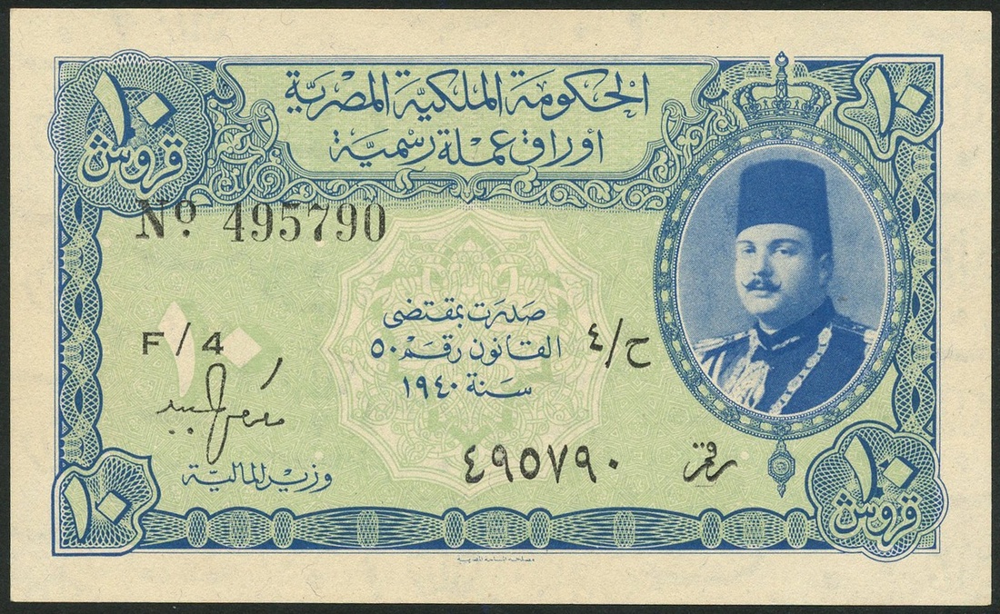 (x) Egyptian Government Currency Note, 10 piastres, L.1940, serial number F/4 495790, blue on green underprint, King Farouk at right, value at corners