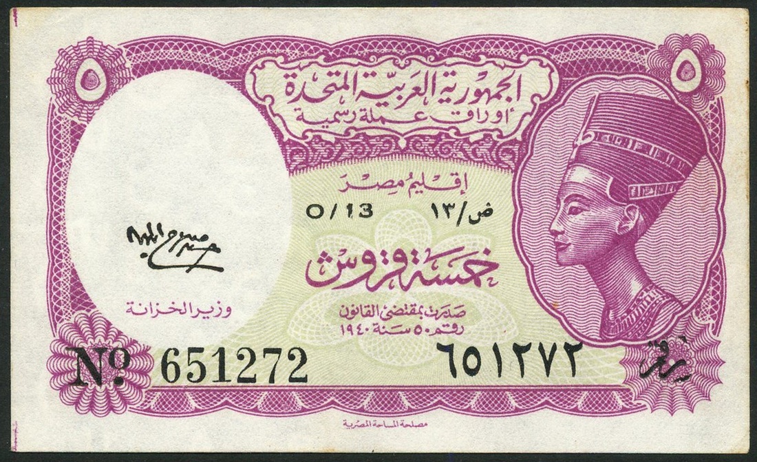 Egyptian Currency note, 5 piastres (6), El Kaissaouny signatures (4), H.Salah Edin signature (2), United Arab Republic, 5 piastres, El Boghdady signatures, lilac on green, Queen Nefertiti at right, reverse brown and orange, guilloche pattern, value at right