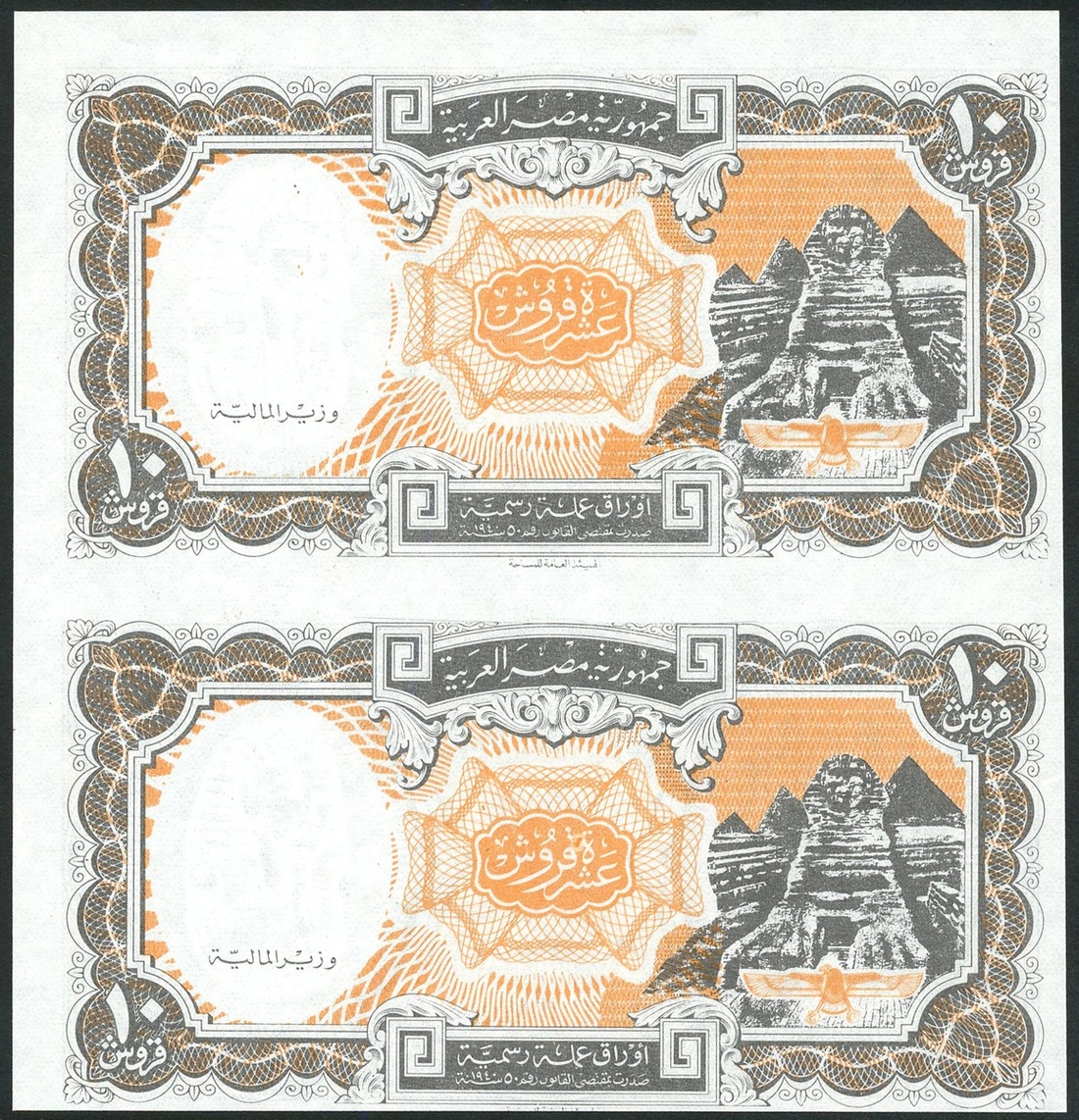 (x) Arab Republic of Egypt, an uncut pair of 10 piastres, type of 1998, orange, brown and white, sphinx and pyramids at right, reverse green and orange, the Mosque of Mohammed Ali at left
