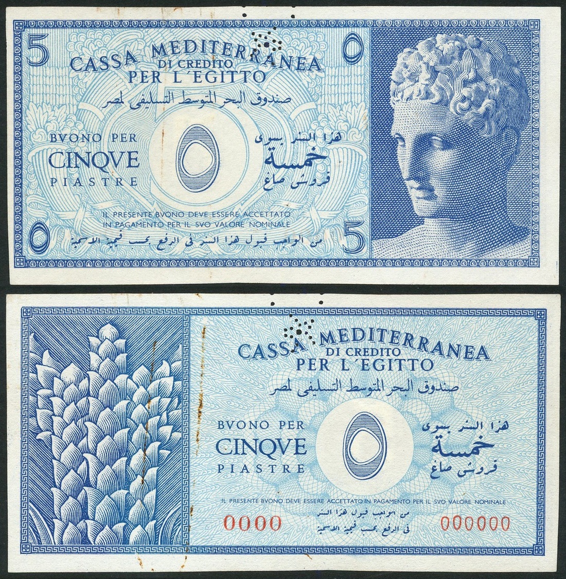 Cassa Mediterranea di Credito Per L'Egitto, specimen 5 piastres, 1942, zero serial number, navy blue on light blue, bust of Apollo at right, reverse blue, stylised wheat in panel at left