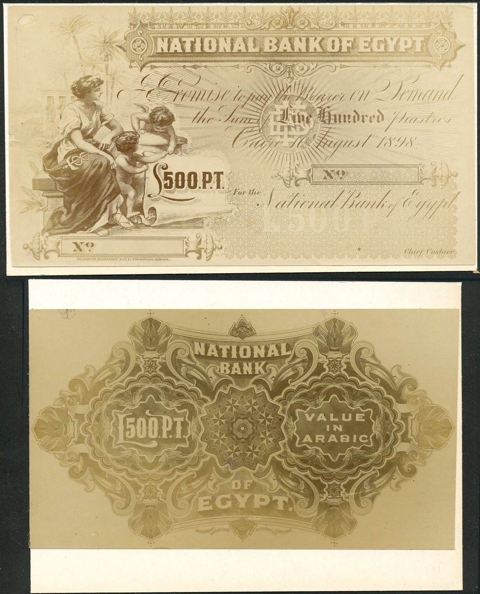 National Bank of Egypt, obverse and reverse archival photograph for 500 piastres, 10 August 1898, black and white, allegorical woman and two children at left, value at centre