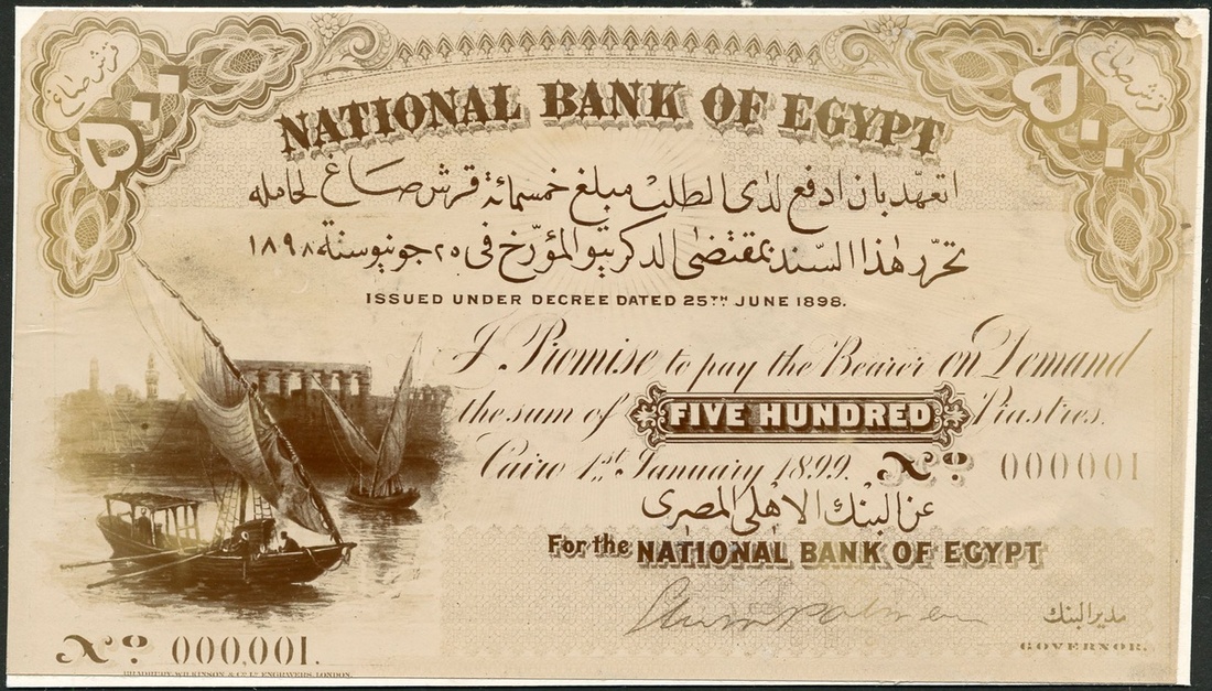 (Pick unlisted), an evolution of the above 1898 design, but with values in Arabic. This example has a felucca (Nile sailing boat) at left, which is very similar to that eventually used on the £10 of 1899