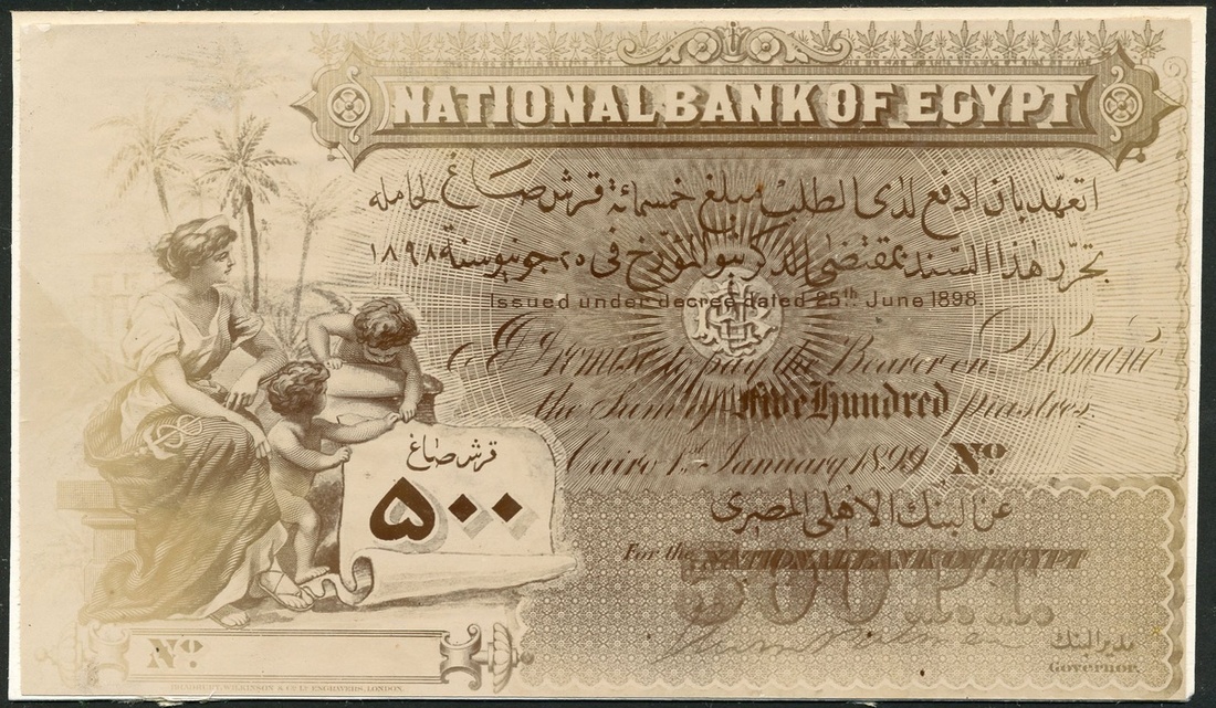 National Bank of Egypt, obverse archival photograph for 500 piastres, 1 January 1899, black and white, allegorical maiden and two children at left, value at centre-left and low right