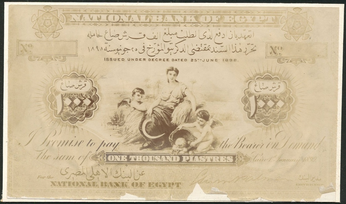 National Bank of Egypt, obverse archival photograph for 1000 piastres, 1 January 1899, black and white, allegorical maiden and two children at centre, value at left and right