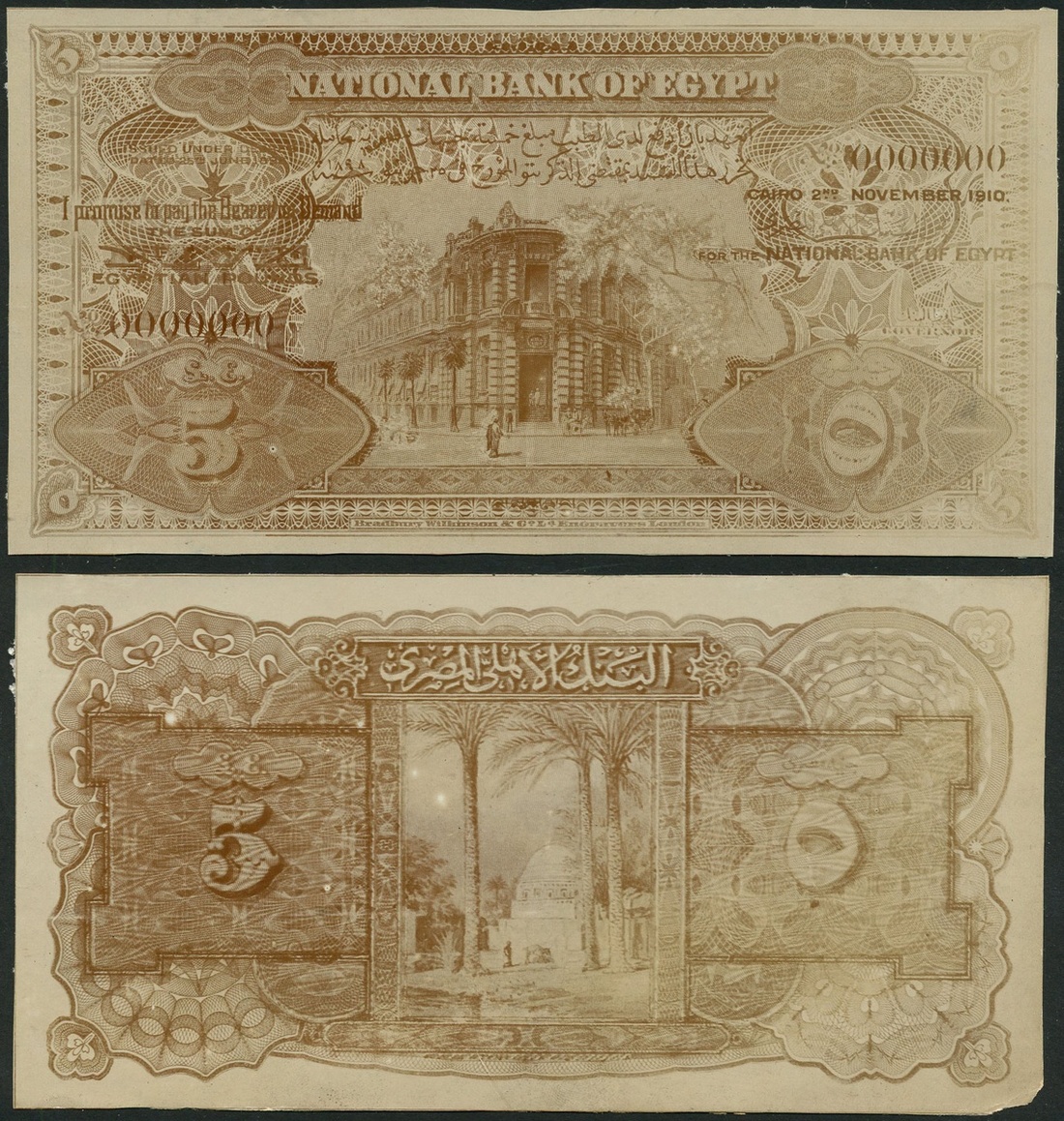 (Pick unlisted), These designs are interesting and confusing for a number of reasons. First and foremost, the design is dated 1910, but a note with a virtually identical design was issued in 1924. it is unclear whether this design was created as early as 1910 and then only used 14 years later, or whether the designer put the incorrect date on the mock-up. it is interesting to note that in the final design of 1924, the Arabic man in the foreground was changed to a policeman, presumably guarding the bank building. Other differences from the issued note include the straight text at the top (this was curved), the large 5 in the low left and right (these were shrunk significantly) and the later addition of two pharaonic heads at the top left and right. Even these four designs are not identical. There are several differences in the underprint and placement of text elements (5)