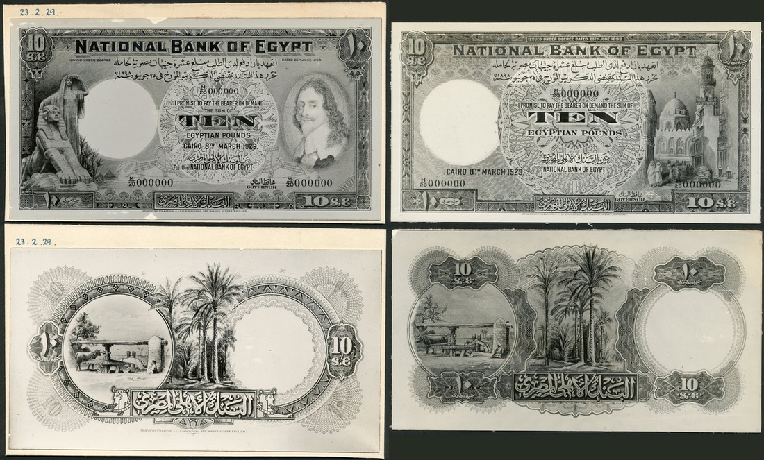 National Bank of Egypt, obverse (4) and reverse (3) archival photographs showing designs for £10, 8 March 1929, black and white, first with portrait of Charles I of England at right, colossi at left, value at centre and corners, others with Street Scene at right, reverses showing ox powered water lift at left