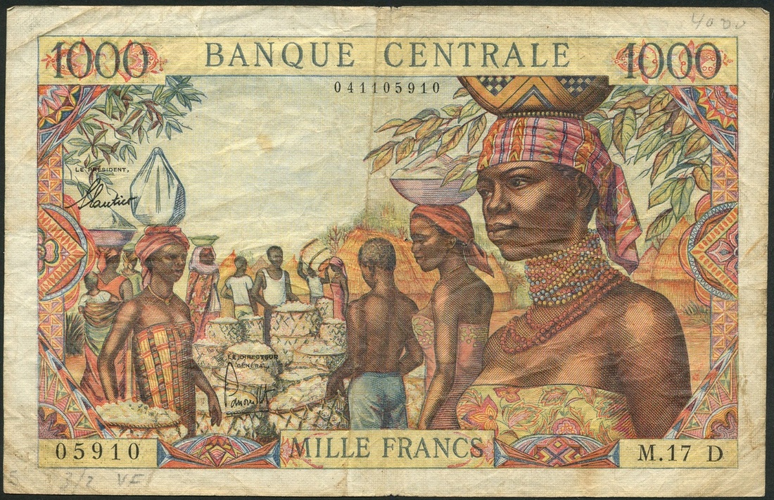 Banque Centrale, Equatorial African States, 100 francs, ND (1963-), C, multicoloured, man at right, 500 francs, D, multicoloured, digger and girl, 1000 francs, D, multicoloured, local market scene