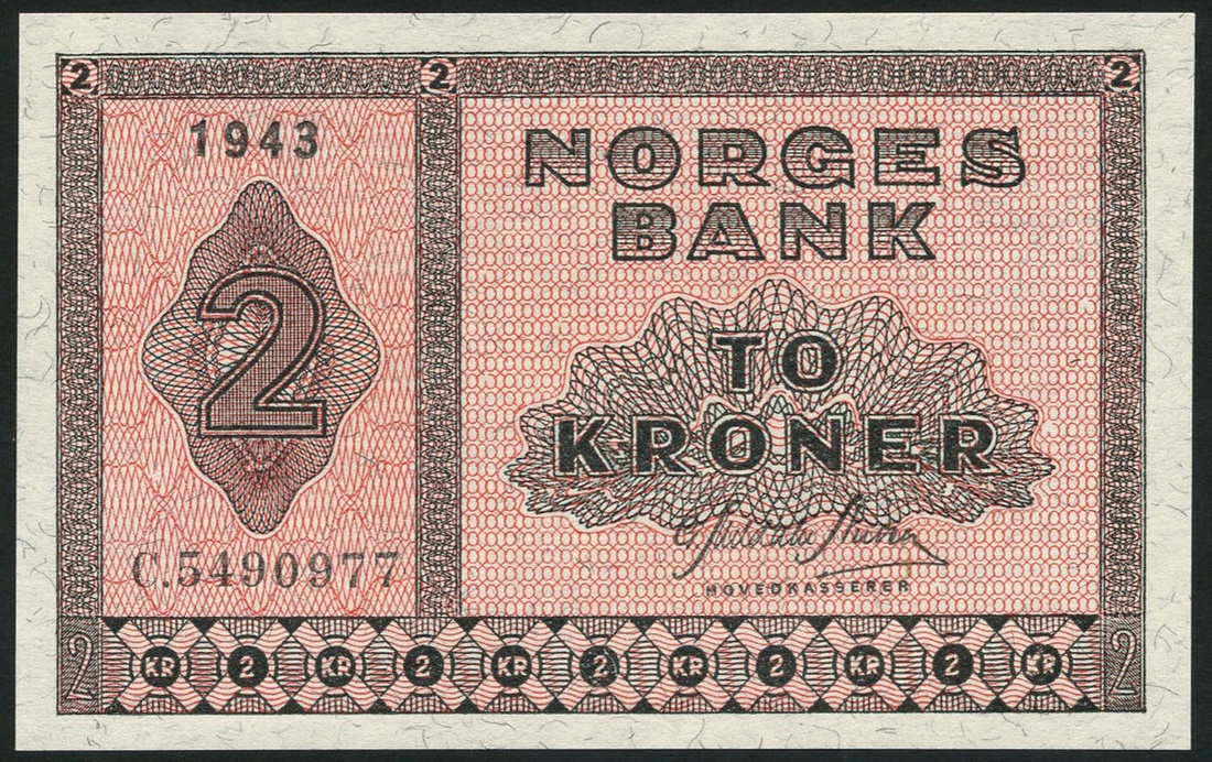 (x) Norway, Skillemyntsedler issue, 1 krone (3), 1943, green and brown, and 2 kroner (3), 1943, pink and brown, lac