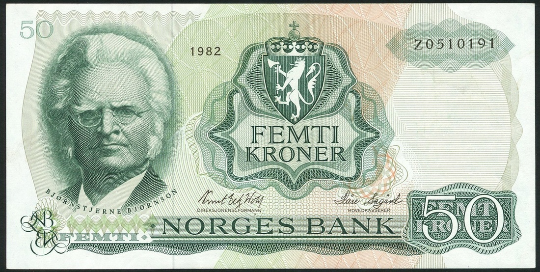 (x) Norges Bank, 50 kroner, 1966, 1982, first serial prefix X, second prefix Z, green, Bjornsson at left, arms top centre