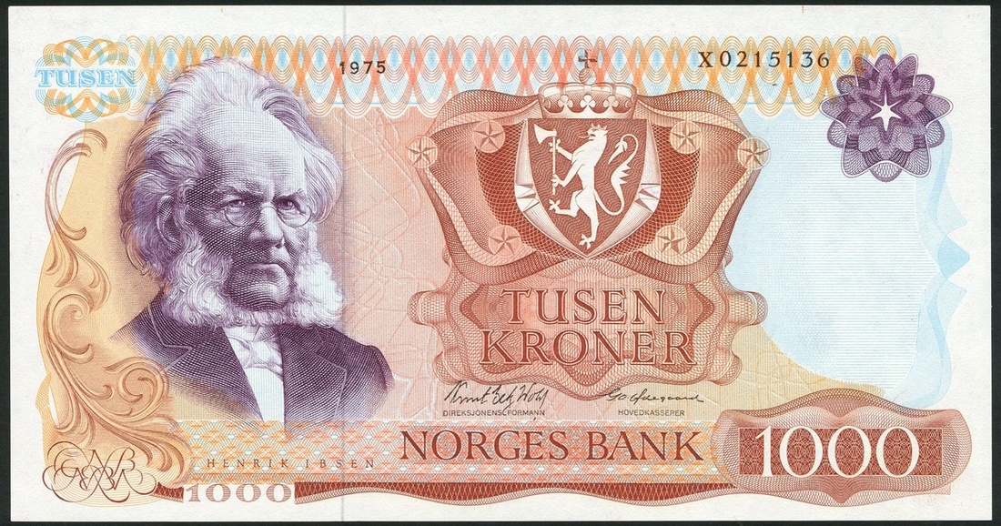 (x) Norges Bank, 1000 kroner, 1975, serial number X 0215136, pink-brown and pale blue, Ibsen at left, arms top centre