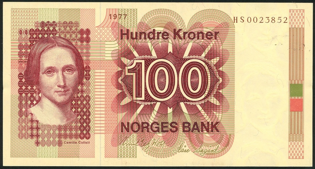 (x) Norges Bank, 100 kroner (4), 1977, all serial number HS 0023852, purple and pink, Collett at left, Wold and Sagard signatures
