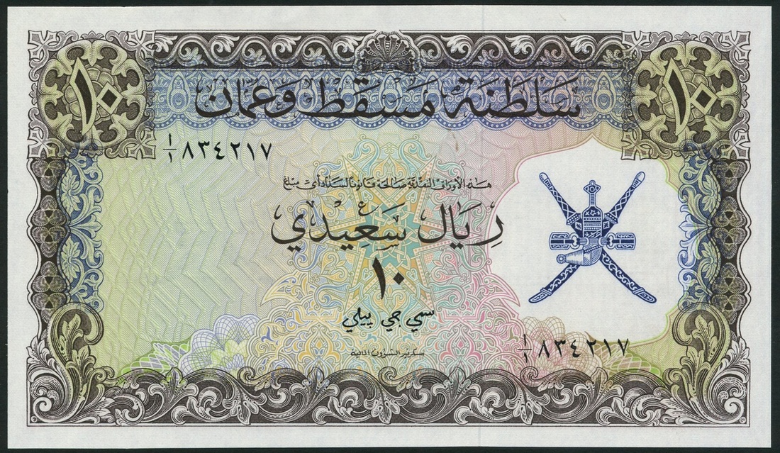 Sultanate of Muscat and Oman, an issued set of the ND (1970) series comprising, 100 baiza, ¼, ½, 1, 5 and 10 rials, brown, blue, green, red, purple and brown respectively, all feature arms at right