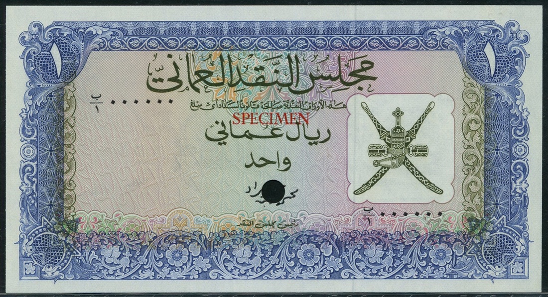 Oman Currency Board, a partial set of colour trials of the ND, 1973 issue consisting of, 100 baiza, ¼, ½ and 1 rial Omani, purple, green, black with purple and blue respectively, all with arms at right