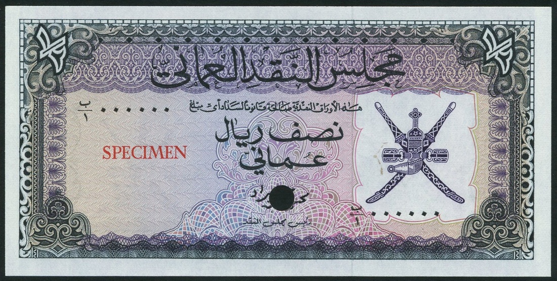 Oman Currency Board, colour trial ¼ rial, ND (1973) and ½ rial, ND (1973), green and black with purple respectively, arms at right, value top left and right
