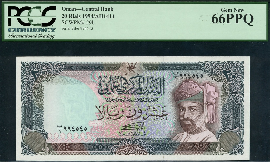 (x) Central Bank of Oman, 20 rials, 1994, serial number B/6 994545, grey-green on multicolour underprint, portrait Sultan Qaboos bin Said at right, value top left and right, highly ornate border, reverse, bank headquarters