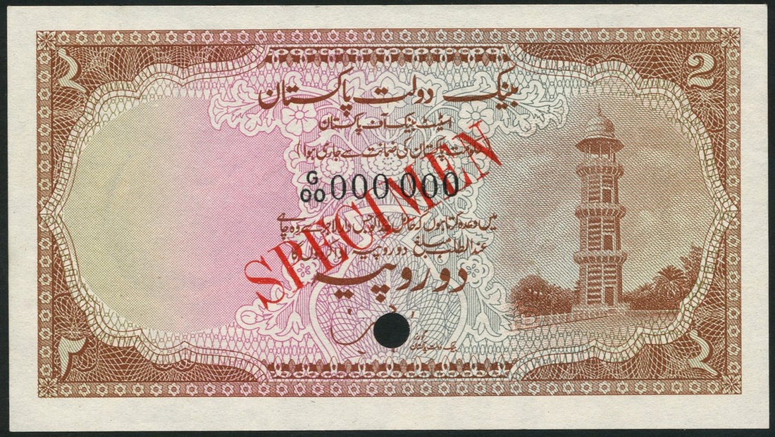 (†) Government of Pakistan, specimen 1 rupee, ND (1953), prefix A/00, blue on pale pink underprint, arms at right, value at each corner, Mumtaz Hasan signature, reverse blue, Naulakha Pavilion in Shahi Qila, also State Bank of Pakistan, specimen 2 rupees, ND (1949), prefix G/00, brown, pink and pale grey, a minaret at the tomb of the Mughal Emperor Jahangir