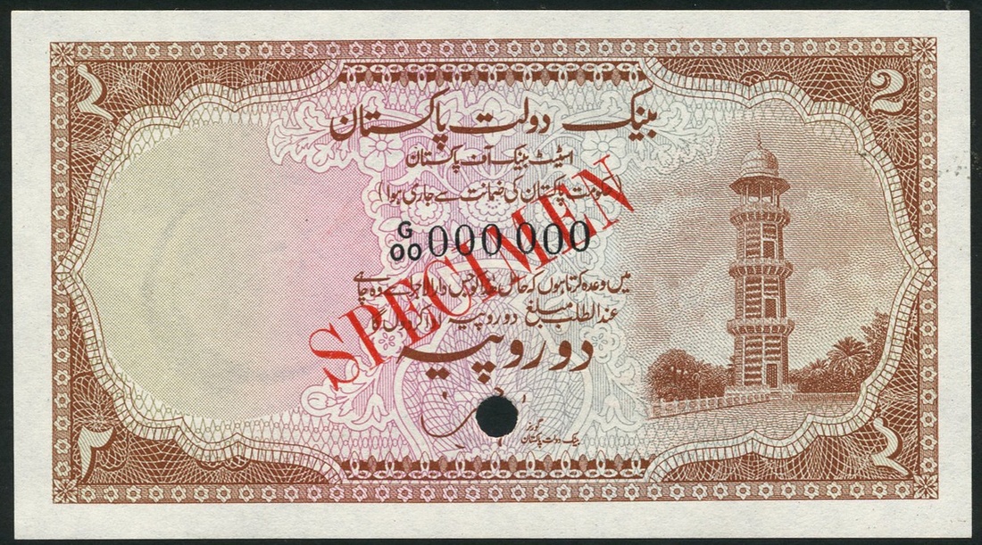 (†) Government of Pakistan, specimen 1 rupee, ND (1953), prefix A/00, blue on pale pink underprint, arms at right, value at each corner, Mumtaz Hasan signature, reverse blue, Naulakha Pavilion in Shahi Qila, also State Bank of Pakistan, specimen 2 rupees, ND (1949), prefix G/00, brown, pink and pale grey, a minaret at the tomb of the Mughal Emperor Jahangir