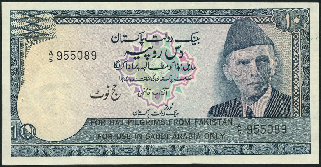 State Bank of Pakistan, Haj issue, 10 rupees (3), ND (1978), serial numbers A/5 955089-090 and A/5 968896, blue on multicolour underprint, Jinnah at right