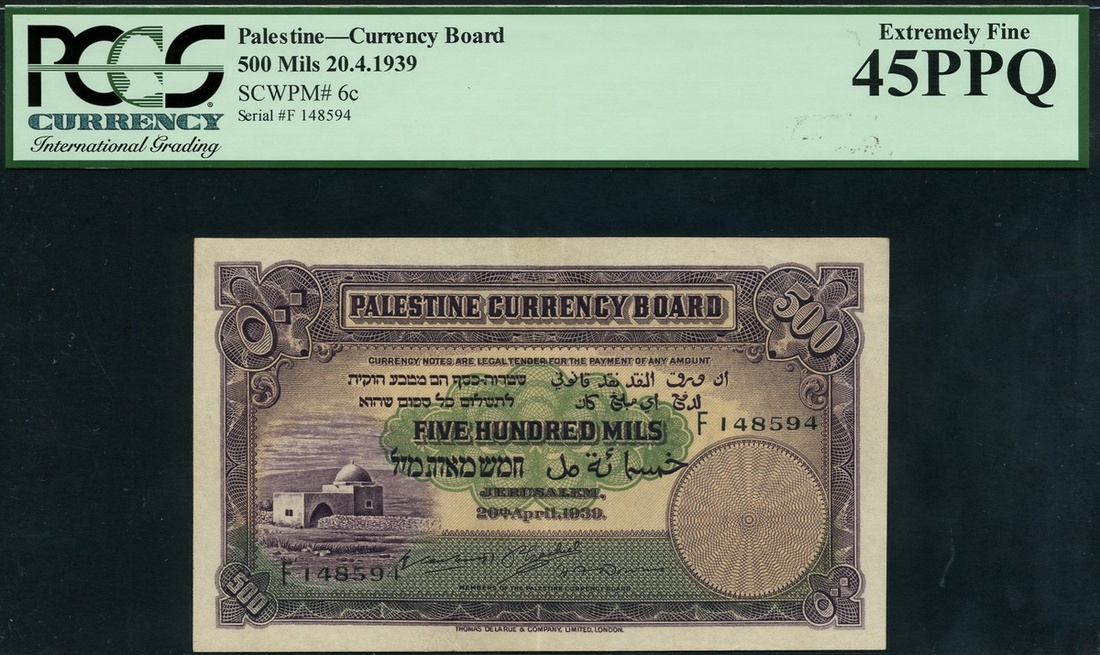 (x) Palestine Currency Board, 500 mils, 20 April 1939, serial number F148594, purple on green underprint, Rachels Tomb at left, value at centre and corners, Ezechiel, Caulcutt and Downie signatures, reverse purple, Tower of David at centre