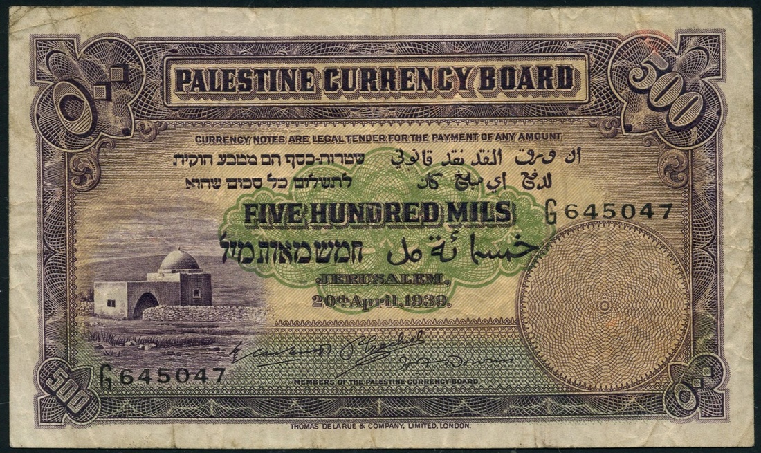 (x) Palestine Currency Board, 500 mils, 20 April 1939, serial number G645047, purple on green underprint, Rachels Tomb at left, value at centre and corners, Ezechiel, Caine, Eastwood and Kershaw signatures, reverse purple, Tower of David at centre