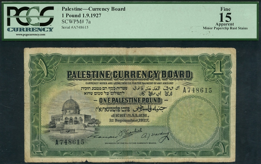 (x) Palestine Currency Board, £1, 1 September 1927, serial number A748615, green and pale yellow, the Dome of the Rock, Jerusalem at left, value at each corner, Ezechiel, Couper and Harding signatures, reverse green, the Citadel of Jerusalem at centre, value at left and right and low centre