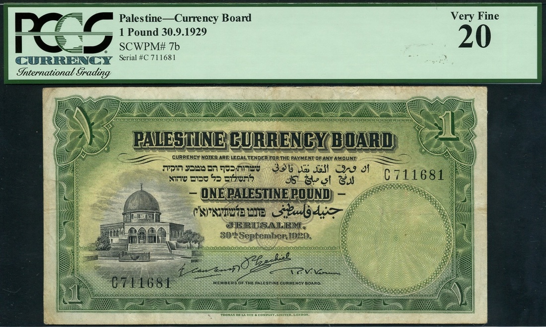 (x) Palestine Currency Board, £1, 30 September 1929, serial number C711681, green on yellow underprint, the Dome of the Rock at left, value at centre and corners, Ezechiel, Caulcutt and Vernon, signatures, reverse green, Tower of David at centre