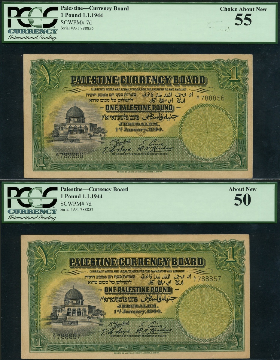 (x) Palestine Currency Board, £1 (2), 1 January 1944, serial numbers A/1 788856 and 788857, green on yellow underprint, the Dome of the Rock at left, value at centre and corners, Ezechiel, Caine, Eastwood and Kershaw signatures, reverse green, Tower of David at centre