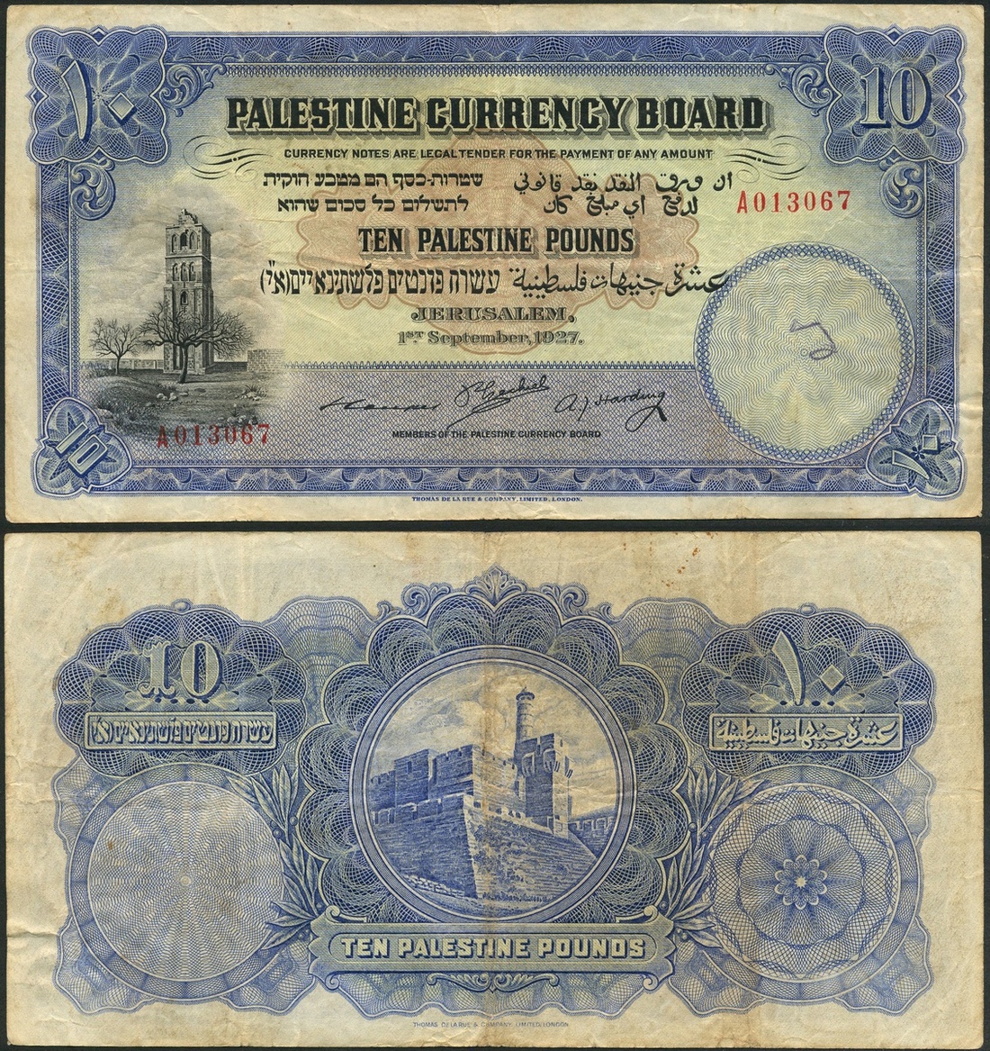 (x) Palestine Currency Board, £10, 1 September 1927, serial number A013067, black and blue on orange and green underprint, the Crusaders Tower at Ramleh at left, value at centre and corners, reverse blue, the Tower of David and the Citadel of Jerusalem at centre, Ezechiel, Couper and Harding signatures