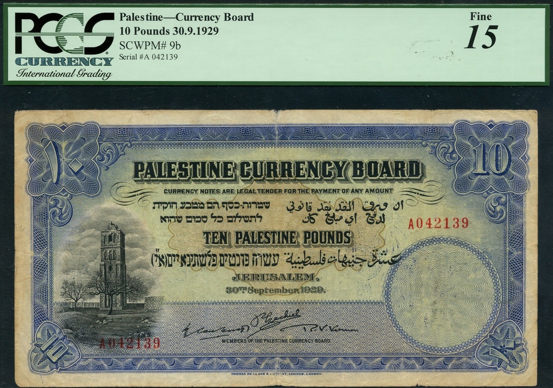 (x) Palestine Currency Board, £10, 30 September 1929, serial number A042139, blue and black on orange and green underprint, Crusaders Tower at Ramleh at left, value at centre and corners, Ezechiel, Caulcutt and Vernon signatures, reverse blue, the Tower of David and the Citadel of Jerusalem at centre