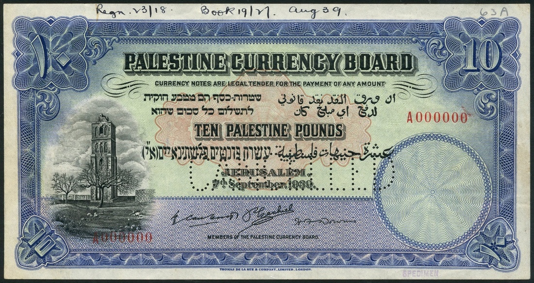 (†) Palestine Currency Board, specimen £10, 20 April 1939, red serial number A 000000, blue and black on pale green underprint, a light brown central guilloche, Crusaders Tower at Ramleh at left, Caulcutt, Ezechiel and Downie signatures, reverse the Tower of David and the Citadel of Jerusalem at centre
