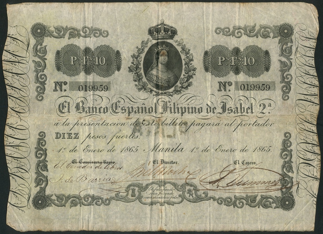 Spanish Philippines, El Banco Espanol Filipino de Isabel, 10 pesos, Manila, 1 January 1865, serial number 019959, black text on cream watermarked paper, crowned portrait of Queen Isabel II in circular frame at top centre flanked by values in ornate guilloche patterns, ornate calligraphy along left margin, three manuscript signatures; Royal Commission, Director and Cashier, embossed seal at left