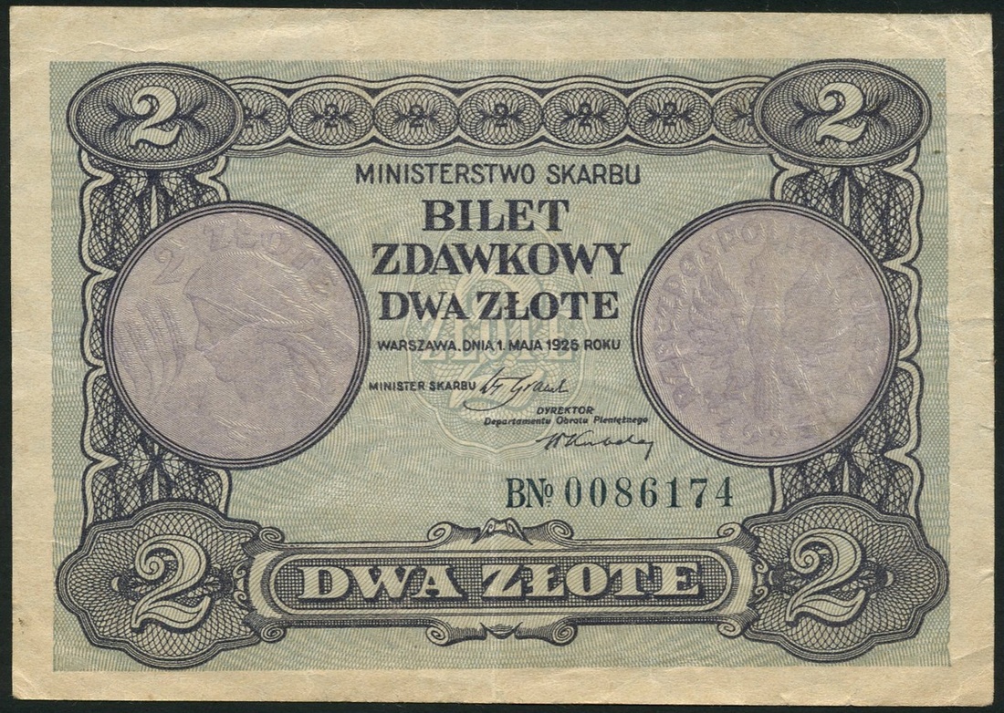 (x) Ministry of Finance, Poland, 2 zlote, 1919, serial number 0086174, mauve and pale blue-green, coin at left and right, reverse text