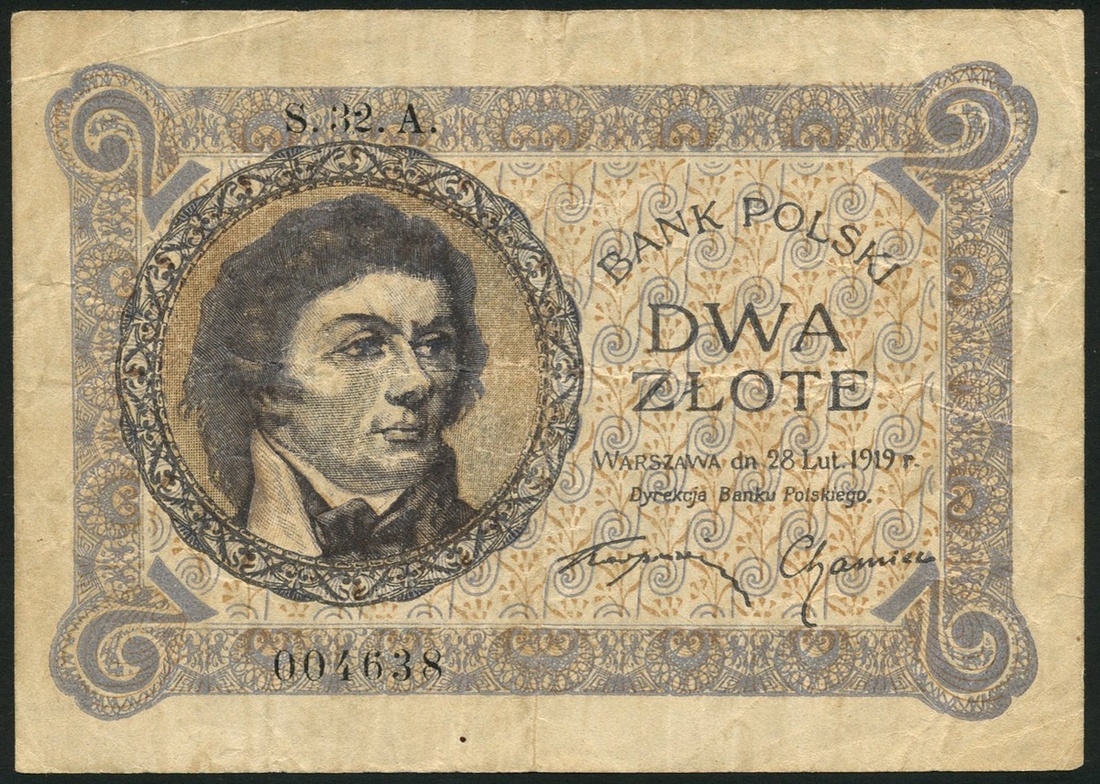 (x) Ministry of Finance, Poland, 2 zlote, 1919, serial number 004638, light and dark blue, T. Kosciuszko at left, reverse pale blue, value