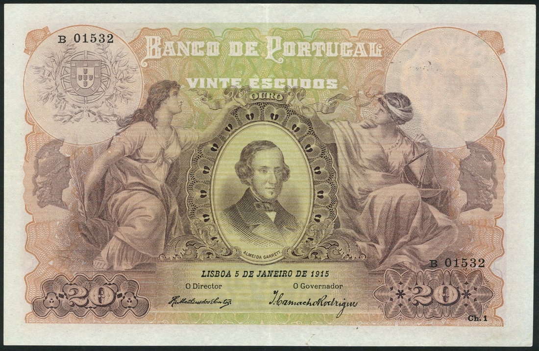 Banco de Portugal, 20 escudos, 5 January 1915, serial number B 05132, light brown, lilac and green, portrait Almeida Garrett in ornate frame at centre flanked by allegorical maidens, arms top left, value low left and right, reverse, blue, green and yellow, arms at centre with value low left and right
