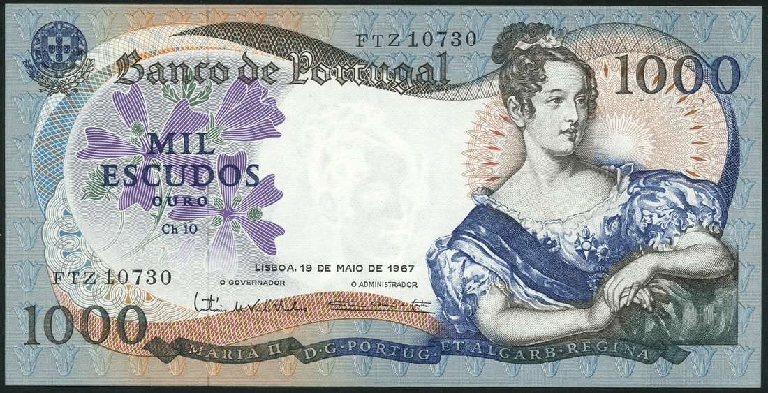 (x) Banco de Portugal, 1000 escudos, 19 May 1967, serial number FTZ 10730, brown and purple, Maria II at right, also 500 escudos, 6 September 1979, serial number KLN 25122, red-brown, Joao II at right, and 500 escudos, 4 October 1979, serial number ARL 78175, Sanches at right