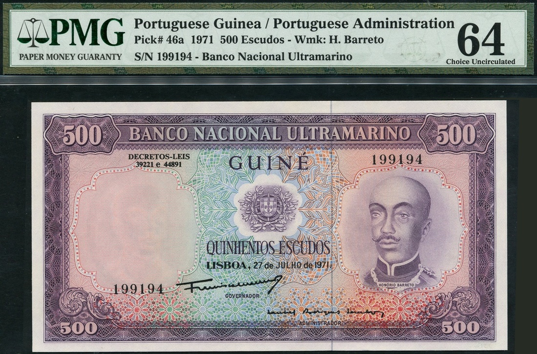 (x) Banco Nacional Ultramarino, Portuguese Guinea, a set of the 1971 issue comprising 50, 100 and 500 escudos, brown, blue and purple respectively, first two with Tristao at right, last with Barreto at right