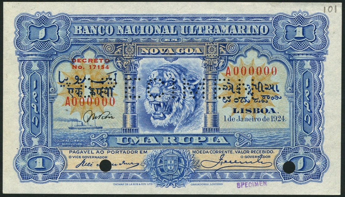 (†) Banco Nacional Ultramarino, Portuguese India, specimen 1 rupia, 1 January 1924, red serial number A 000000, blue and pale orange, tiger at centre, arms low centre, reverse blue, temple