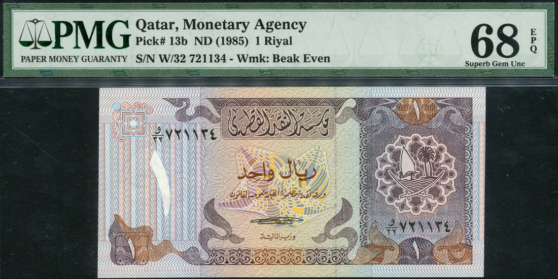 Qatar Monetary Agency, 1 riyal, 1980, serial number W/10 892913, brown and multicolour, coat of arms at right, ornate patterns, 1 riyal, 1985, serial number W/32 721134, purple on multicolour, coat of arms at right