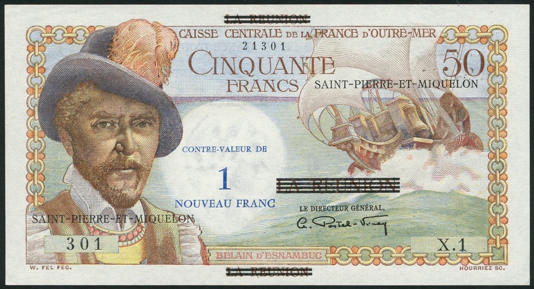 (x) Caisse Centrale de la France d'Outre-Mer, Saint Pierre et Miquelon, 1 new franc on 50 francs, ND (1960 provisional issue), serial number X.1 301, multicoloured, Pierre Belain d'Esnambuc at left, galleon at right, La Reunion struck out at low right and in margins, 1 nouveau franc overprint