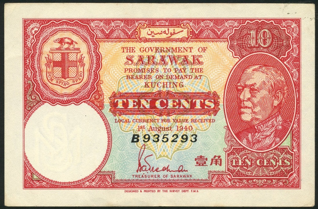 (x) Government of Sarawak, emergency 10 cents, 1 August 1940, serial number B 935293, red, orange and pale green-blue, Charles Vyner Brooke at right, arms top left, Bertram Trechman signature