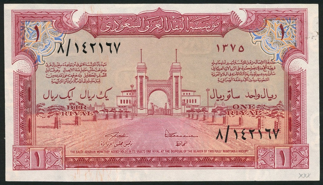 (x) Saudi Arabian Monetary Agency, Haj Pilgrim receipt, 1 riyal, 1965, red, gateway of the Palace of King Saud in Jiddah at centre, reverse pale brown