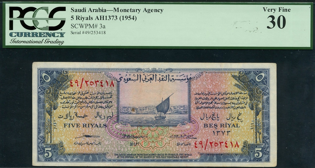 (x) Saudi Arabian Monetary Agency, Haj Pilgrim receipt, 5 riyals, 1373 (1956), serial number 66/755591, blue on multicolour underprint, Jiddah harbour with dhow at centre, reverse brown, reverse blue, palm and crossed swords at centre