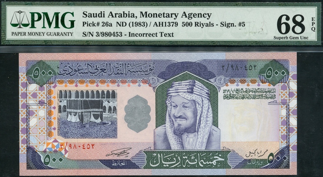 (x) Saudi Arabian Monetary Agency, 500 riyals, ND (1983), serial number3/980453, purple and green on multicolour underprint, portrait King Abdul Aziz, Ka’aba in the courtyard of the Holy Mosque at left, value in each corner, reverse, Holy Mosque in Mecca, national emblem low right